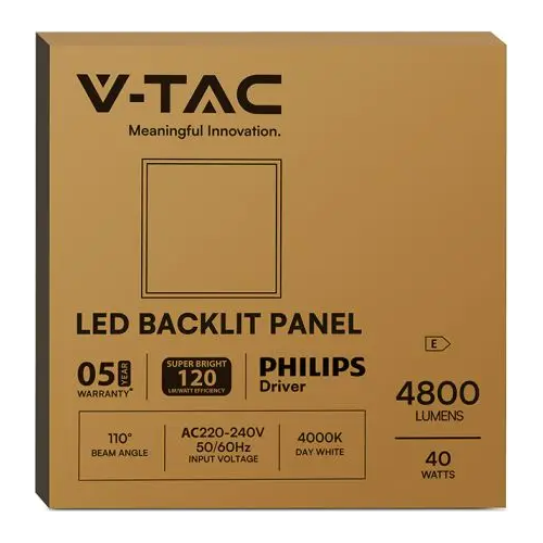 Το πάνελ LED V-TAC 40W παρέχει φωτεινότητα 4800 lumen με ενεργειακή απόδοση 120 lm/W. Το ψυχρό λευκό φως 6500K δημιουργεί έντονο και καθαρό φωτισμό, κατάλληλο για επαγγελματικούς χώρους και γραφεία.