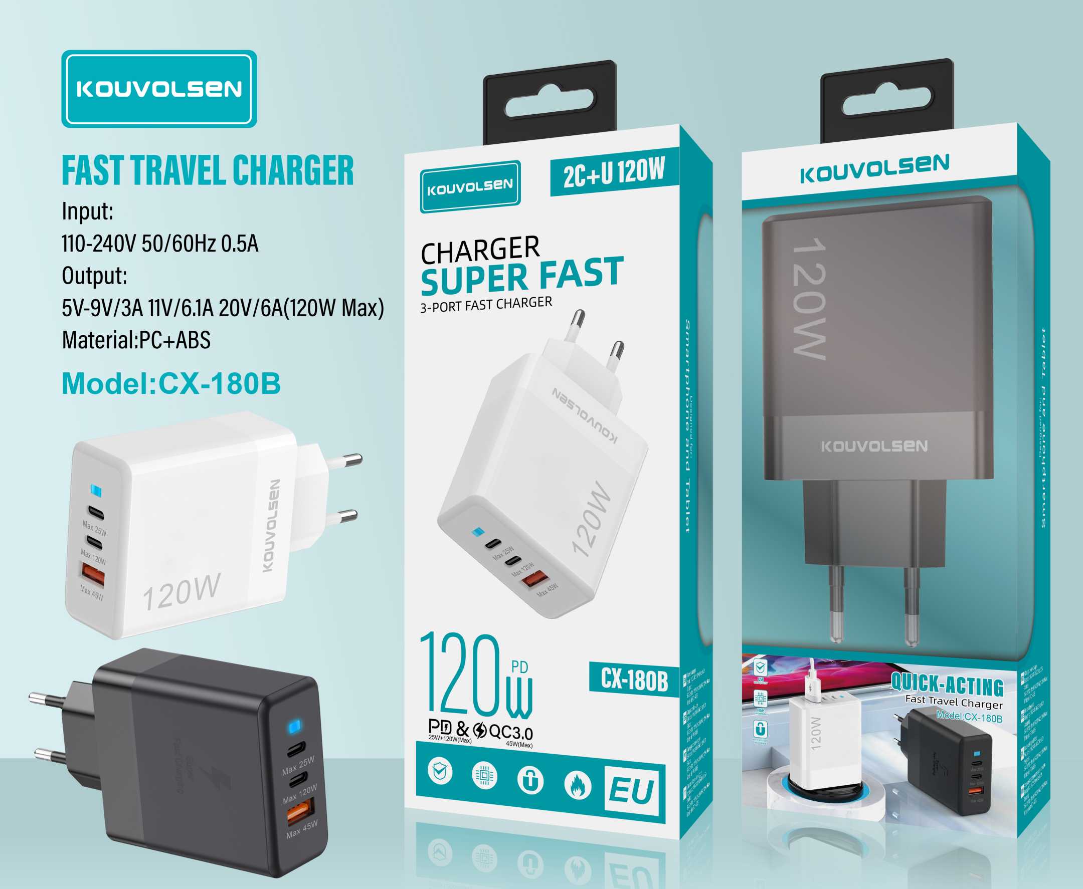 Αντάπτορας φόρτισης Fast Charge με 3 θύρες USB-A & Type-C - 120W - CX-180B - 271801 - Black