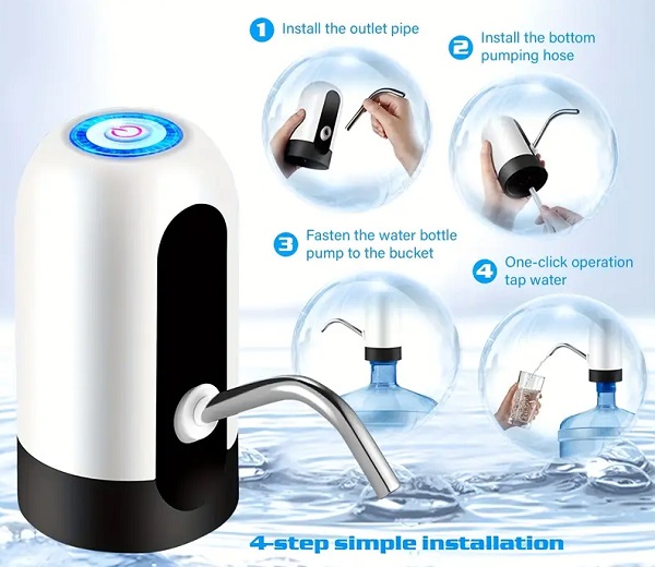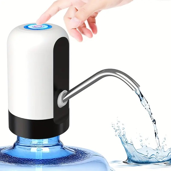Φορητή αντλία νερού που εφαρμόζει σε μπουκάλες νερού για ψύκτη. Φορτίζει με καλώδιο Micro USB (περιλαμβάνεται): με μια πλήρη φόρτιση 5 ωρών μπορείτε να το χρησιμοποιήσετε για 20 ημέρες. Αντλεί το νερό με το πάτημα ενός κουμπιού. Διαθέτει πτυσσόμενη κεφαλή για εργονομία και εύκολη αποθήκευση.  Ισχύς: 2.5W. Επαναφορτιζόμενη Μπαταρία.  Αυτόματο κλείσιμο μετά από 1 λεπτό αδράνειας.  Υλικό κατασκευής: υψηλής αντοχής πλαστικό και ανοξείδωτο ατσάλι. Διαστάσεις: 7.3x13cm. Μήκος στομίου: 11.4cm.
