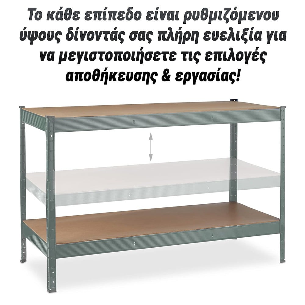 Η ιδανική λύση για όσους αναζητούν ανθεκτικότητα, πρακτικότητα και λειτουργικότητα στον χώρο εργασίας τους. Κατασκευασμένος από υψηλής ποιότητας γαλβανισμένο ατσάλι, προσφέρει εξαιρετική σταθερότητα και μακροχρόνια αντοχή, ακόμη και σε απαιτητικές συνθήκες. Πάγκος Εργασίας χωρίς βίδες & παξιμάδια! Γρήγορος και εύκολος στη συναρμολόγηση πάγκος εργασίας με αποθηκευτικό χώρο, χωρίς βίδες που το καθιστά ιδανικό για: →Γκαράζ →Εργαστήριο →Γραφείο →Βοηθητικό χώρο →Εργαστήριο σπιτιού →Χώρους Συσκευασίας Δεμάτων →Μονάδες παραγωγής και όπου αλλού υπάρχει ανάγκη! Στιβαρός σκελετός 2 επιπέδων με αντοχή 300kg ανά επίπεδο κατασκευασμένος εξ'ολοκλήρου από γαλβανισμένο ατσάλι για μέγιστη αντοχή στο χρόνο, τις διαβρώσεις και την καθημερινή χρήση. Τελικό φινίρισμα με καμπύλες άκρες για αποφυγή τραυματισμών. Ένας από τους πιο ανθεκτικούς και πιο εξυπηρετικούς τύπους που έχουμε να προσφέρουμε! Οργανώστε με ασφάλεια όλα τα εργαλεία σας, ακόμη και τα βαριά! Κάθε επίπεδο μπορεί να αντέξει έως και 300kg, ομοιόμορφα κατανεμημένα - ολόκληρη η κατασκευή έχει δοκιμαστεί για να αντέξει 600kg, ομοιόμορφα κατανεμημένα. Με διαστάσεις 90 cm ύψος, 120 cm μήκος και 60 cm πλάτος, διαθέτει ευρύχωρη επιφάνεια εργασίας που μπορεί να φιλοξενήσει εργαλεία, μηχανήματα ή υλικά χωρίς περιορισμούς. Το επιπλέον κάτω ράφι παρέχει δεύτερο επίπεδο αποθήκευσης, μεγιστοποιώντας τον διαθέσιμο χώρο και προσφέροντας εύκολη οργάνωση για εξαρτήματα και αξεσουάρ. Προσφέρουν έναν ρυθμιζόμενο και διαμορφώσιμο σχεδιασμό που επιτρέπει την εύκολη πρόσβαση σε οτιδήποτε χρειάζεται να οργανώσετε από όλες τις πλευρές τους, προσφέροντας σας μια ευέλικτη επιλογή για την αύξηση της παραγωγικότητας. Στιβαρά επίπεδα με κάθετους και οριζόντιους στύλους, παρέχουν πολύ μεγαλύτερη χωρητικότητα βάρους για την αποθήκευση βαρύτερων αντικειμένων, όπως ογκώδη εργαλεία, μεγάλα εξαρτήματα ή πλεονάζοντα αποθέματα. Βιομηχανικού βαθμού σχεδιασμός και σίγουρη αντοχή, προσφέρουν μεγαλύτερο βαθμό άνεσης, ασφάλειας και αξιοπιστίας. Ο όρος "χωρίς βίδες" προέρχεται από τη συναρμολόγηση. Τα ράφια χωρίς μπουλόνια συναρμολογούνται χωρίς κόπο με τα ενσωματωμένα χωνευτά ελάσματα αντί για τα τυπικά μπουλόνια, τους συνδέσμους και τα διάφορα άλλα συνδετικά εξαρτήματα που απαιτούν κατσαβίδια και κλειδιά για την κατασκευή άλλων, παρόμοιων τύπων ραφιών του εμπορίου. Ενσωματωμένα στα άκρα κάθε μεμονωμένης δοκού, τα ελάσματα ασφαλίζουν σταθερά σε έτοιμες υποδοχές που κλειδώνουν απ' ευθείας στις κολώνες! Η κατασκευή είναι τόσο εύκολη! Δε χρειάζονται ειδικά εργαλεία - ίσως ένα λαστιχένιο σφυρί για να στερεώσετε τα επίπεδα στη θέση τους. Αναμφίβολα αυτό το γρήγορο και εύκολο σύστημα συναρμολόγησης θα σας εκπλήξει ευχάριστα! Η γαλβανιζέ επίστρωση προστατεύει τον πάγκο από σκουριά, φθορά και υγρασία, καθιστώντας τον ιδανικό για χρήση σε γκαράζ, συνεργεία, αποθήκες, επαγγελματικά εργαστήρια αλλά και για απαιτητικούς χομπίστες. Η στιβαρή κατασκευή του εγγυάται ότι μπορεί να αντέξει μεγάλο βάρος, ενώ η συναρμολόγηση είναι απλή και γρήγορη χωρίς περίπλοκες διαδικασίες. “Περιηγηθείτε σε όλη τη γκάμα για να βρείτε και την ιδανική λύση ραφιών ή πάγκων εργασίας χωρίς μπουλόνια για το χώρο εργασίας σας ή επικοινωνήστε μαζί μας για να σας βοηθήσουμε για τους συνδυασμούς που μπορούν να καλύψουν καλύτερα τις ανάγκες σας” Μπορ