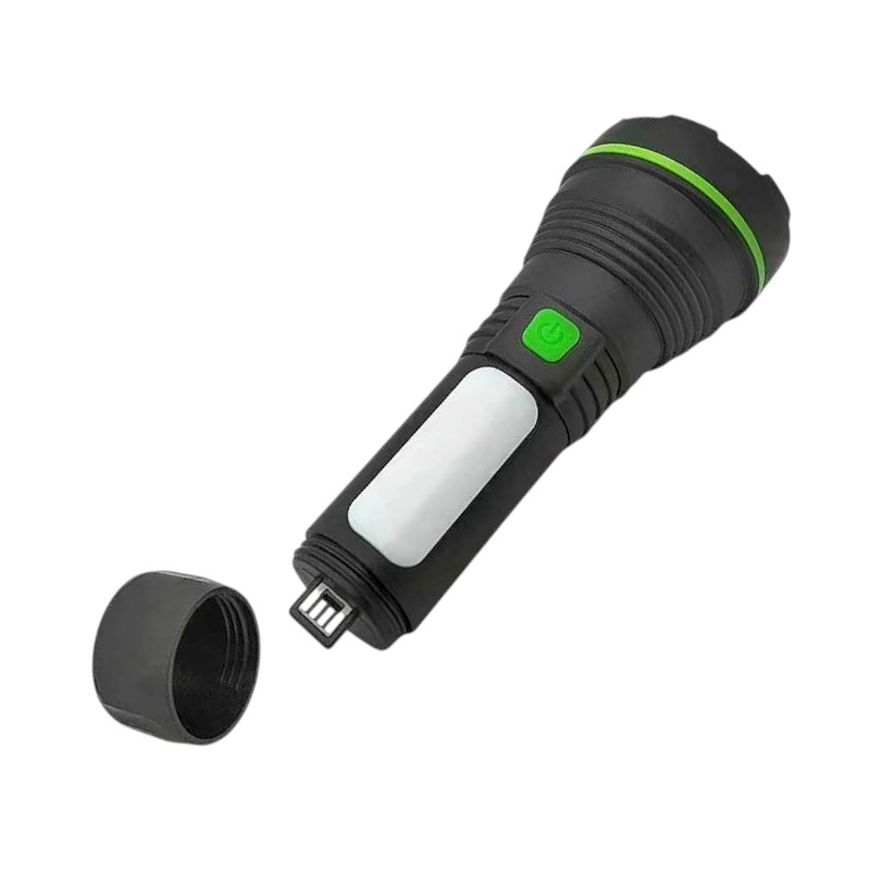 Επαναφορτιζόμενος φακός χειρός υψηλής ισχύος LED με πολλαπλές λειτουργίες. Χαρακτηριστικά: Πλαϊνός φακός COB, Eνσωματωμένη επαναφορτιζόμενη μπαταρία, Ενσωματωμένο βύσμα φόρτισης στο πίσω μέρος με καπάκι.