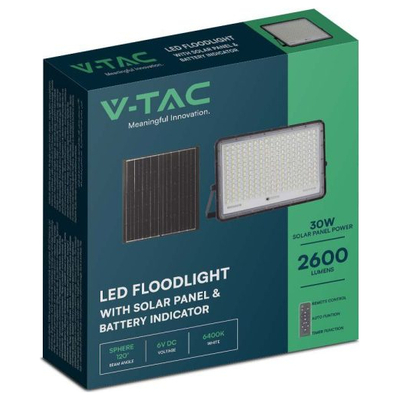 V-TAC Ηλιακός Προβολέας LED 30W 2600lm IP65 με Χειριστήριο & αντικαταστάσιμη μπαταρία Μαύρο Σώμα Ψυχρό Λευκό 7829
