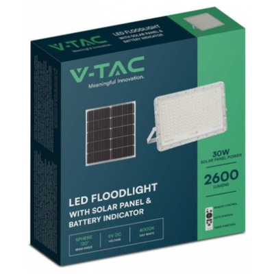 V-TAC Ηλιακός Προβολέας LED 30W Φυσικό Λευκό 4000K με χειριστήριο & αντικαταστάσιμη μπαταρία