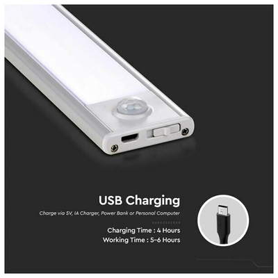 V-TAC Επαναφορτιζόμενο Φωτιστικό Ντουλάπας LED με Αισθητήρα Κίνησης PIR 2W 160lm 180° IP20 40cm Φυσικό Λευκό Ασημί Σώμα 2962