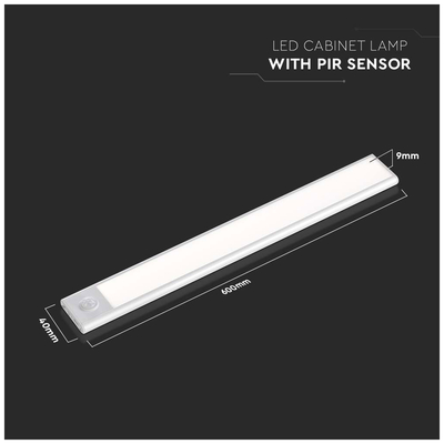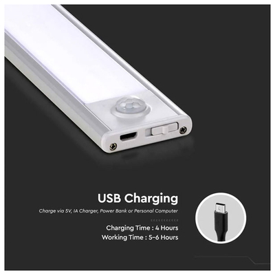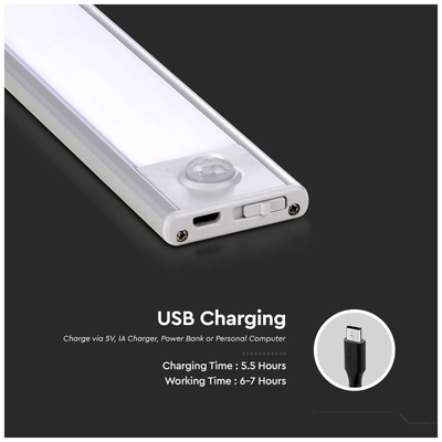 V-TAC Επαναφορτιζόμενο Φωτιστικό Ντουλάπας LED με Αισθητήρα Κίνησης PIR 2.5W 260lm 180° IP20 60cm Ζεστό Λευκό Ασημί Σώμα 2969
