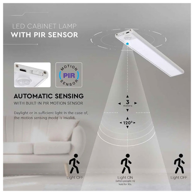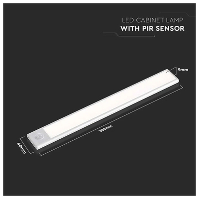 V-TAC Επαναφορτιζόμενο Φωτιστικό Ντουλάπας LED με Αισθητήρα Κίνησης PIR 1.5W 110lm 180° IP20 30cm Ζεστό Λευκό Ασημί Σώμα 2961