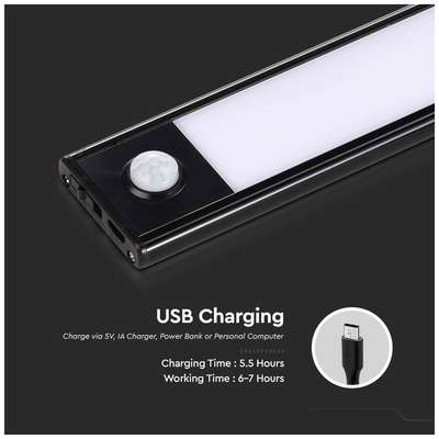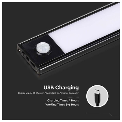 V-TAC Επαναφορτιζόμενο Φωτιστικό Ντουλάπας LED με Αισθητήρα Κίνησης PIR 2W 160lm 180° IP20 40cm Φυσικό Λευκό Μαύρο Σώμα 2963