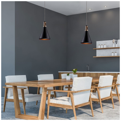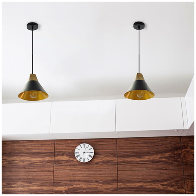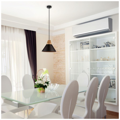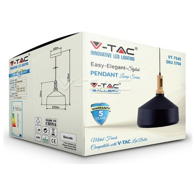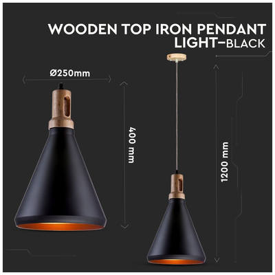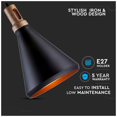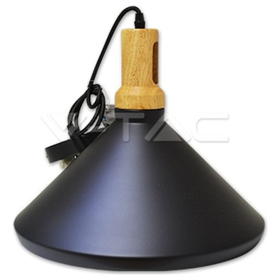 Κρεμαστό Φωτιστικό V-TAC Μεταλλικό Καπέλο Κώνος Μαύρο με Ξύλινη Βάση και ντουί Ε27 Φ250 3762