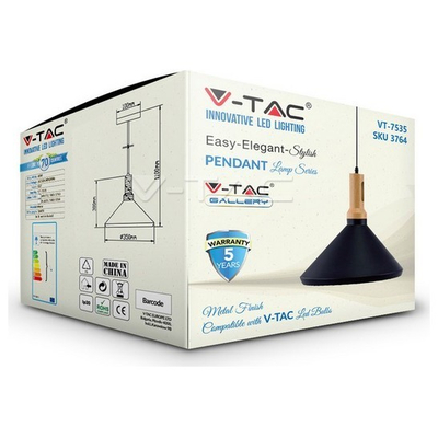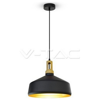 Κρεμαστό Φωτιστικό V-TAC Μεταλλικό Κωνική Καμπάνα Μαύρο με Ξύλινη Βάση και ντουί Ε27 Φ350mm 3764