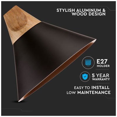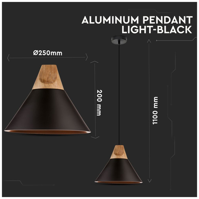 Κρεμαστό Φωτιστικό V-TAC Καπέλο Κώνος Αλουμίνιο Μαύρο με Ξύλινη Βάση και ντουί Ε27 Φ260mm 3757
