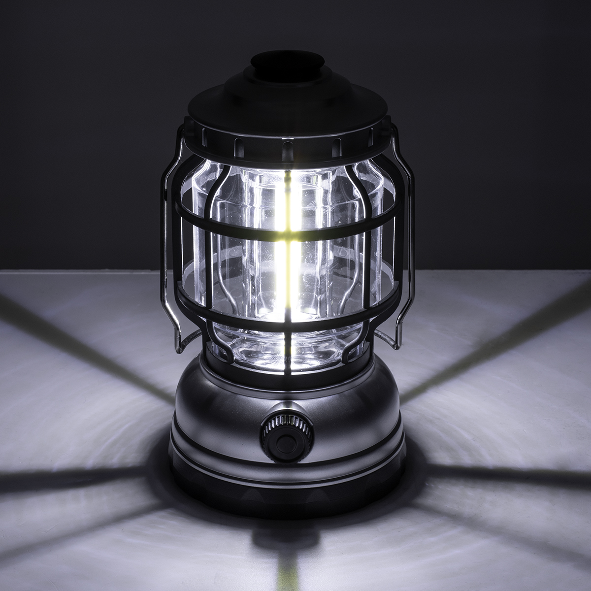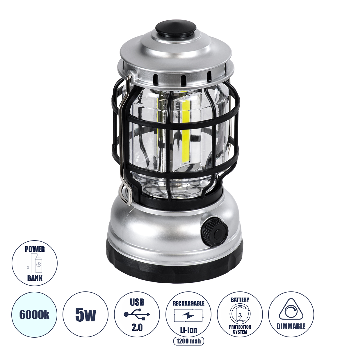 GloboStar® 69933 Αυτόνομο Επαναφορτιζόμενο Φανάρι Camping LED 5W με Επαναφορτιζόμενη Μπαταρία 18650 1200mAh Li-ion - Power Bank - Αδιάβροχο IP54 - Dimmable - Μαύρο Ασημί - Ψυχρό Λευκό 6000K Φ10.2 x Υ18cm
