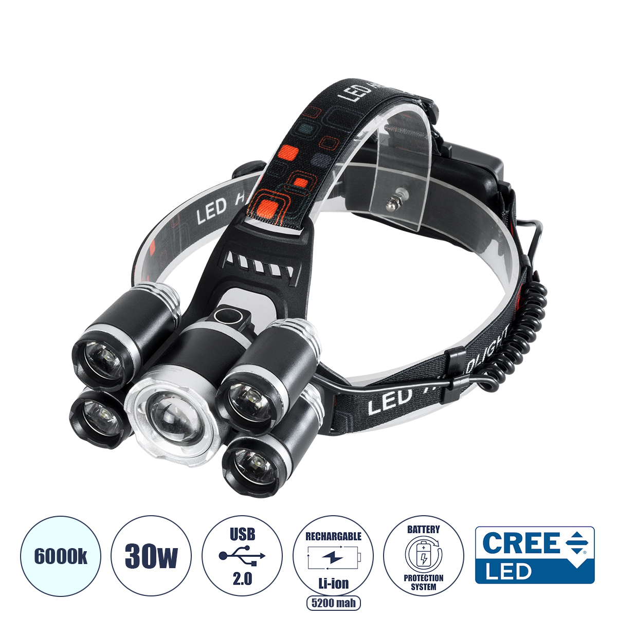 GloboStar® 79059 Φακός Κεφαλής Επαναφορτιζόμενος LED CREE XML2-T6 Chip 30 Watt 2000lm με 2 x 18650 Μπαταρίες 5200mAh Ψυχρό Λευκό 6000K - Μ9 x Π7.5 x Υ9cm