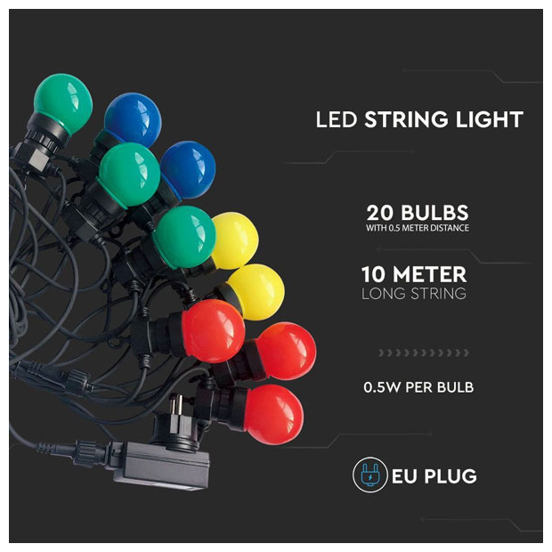 Καλωδιογιρλάντα Φωτιστικό 10 μέτρα με 20 Λαμπτήρες 0,5W 600lm για Εξωτερικό Χώρο IP44 Πολύχρωμους RGB+Κίτρινο Αδιάβροχο 7438 V-TAC