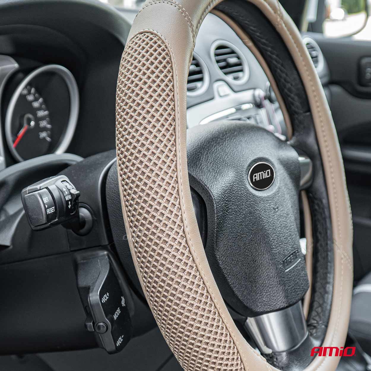 ΚΑΛΥΜΜΑ ΤΙΜΟΝΙΟΥ SWC-61 (M) 37>39cm ΜΠΕΖ ΜΕ ΤΡΥΠΗΤΟ ΣΧΕΔΙΟ ΣΤΑ ΠΛΑΙΝΑ AMIO - 1 ΤΕΜ. • Κατασκευασμένο από υλικά υψηλής ποιότητας που δεν εκπέμπουν οσμές. • Προστατεύει τέλεια το τιμόνι από την τριβή ή καλύπτει προηγούμενες ζημιές. • Η εσωτερική πλευρά του καλύμματος είναι αντιολισθητική και εμποδίζει την ολίσθηση του καλύμματος. Μέγεθος: 37-39 cm. Συσκευασία 1 τεμαχίου