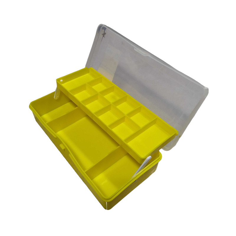 Πλαστικό κουτί-κασετίνα με 2 επίπεδα, ιδανικό για την αποθήκευση και μεταφορά των αξεσουάρ αλιείας σας, με πολλαπλές θήκες και διαχωριστικά.