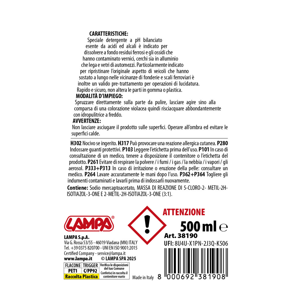 Ειδικό καθαριστικό με ισορροπημένο pH, χωρίς οξέα και αλκάλια, κατάλληλο για την πλήρη διάλυση σιδηρούχων υπολειμμάτων και οξειδίων που έχουν μολύνει το χρώμα, τις αλουμινένιες και κράμα ζάντες καθώς και τα κρύσταλλα του οχήματος.