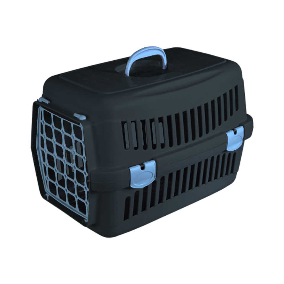 Το Felix Mix Box είναι κουτί μεταφοράς κατοικιδίων σε μαύρο χρώμα με γαλάζια κουμπώματα, με διαστάσεις 48 × 32,5 × 32,5 cm,
