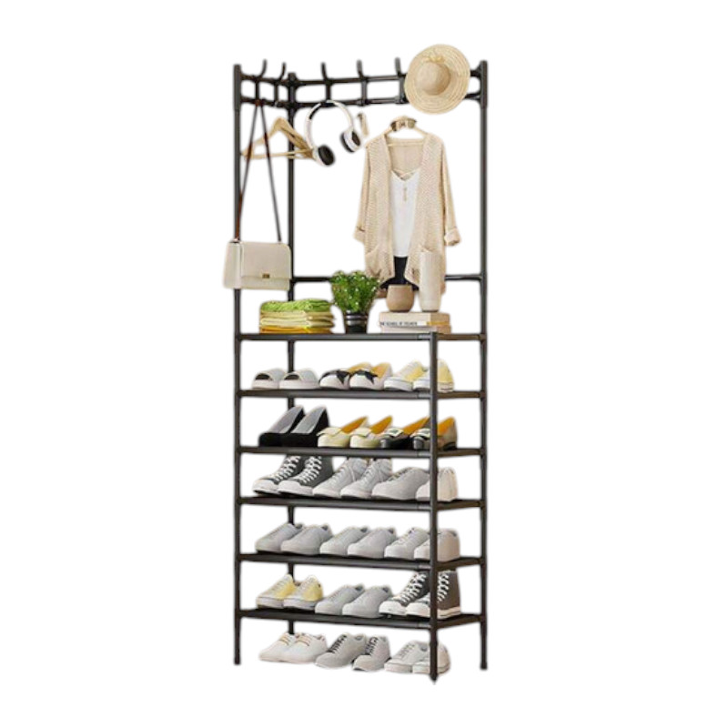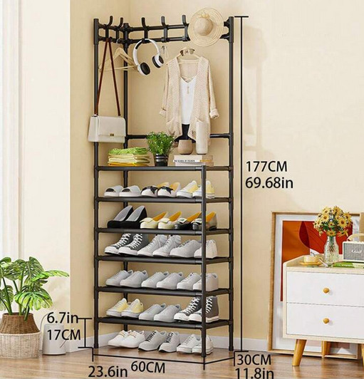 Κρεμάστρα δαπέδου μεταλλική, γωνιακή, με 6 υφασμάτινα ράφια παπουτσιών, ιδανική ως έπιπλο εισόδου ή για την οργάνωση των ρούχων στο δωμάτιό σας . Διαστάσεις: 177 x 60 x 30 cm.