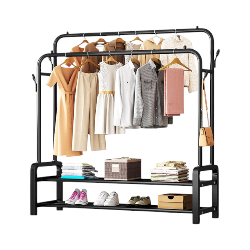 Κρεμάστρα δαπέδου μεταλλική, με 2 ράφια παπουτσιών και πλαϊνές κρεμάστρες, ιδανική ως έπιπλο εισόδου ή για την οργάνωση των ρούχων στο δωμάτιό σας.