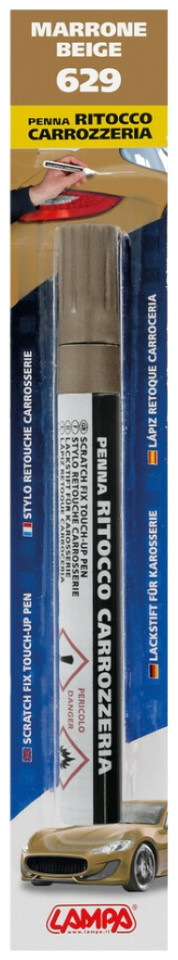 Στυλό επισκευής γρατζουνιών SCRATCH FIX TOUCH-UP PENS από τη εταιρία LAMPA, ιταλικής προέλευσης, σε μπεζ χρώμα με κωδικό χρώματος 629, κατάλληλο για το "γέμισμα" των γρατζουνιών (φθορών/εκδορών), ώστε κατόπιν εφαρμογής να υπάρχει ένα ενιαίο φινίρισμα στην επιφάνεια του οχήματος. Το χρώμα του στυλό είναι απόλυτα ταιριαστό με το εργοστασιακό χρώμα του αυτοκινήτου και ο αριθμός του κωδικού (629) ταυτίζεται πλήρως με τον αριθμό που αναγράφεται πάνω στο αμάξωμα του εκάστοτε οχήματος (βλ. πίνακα εφαρμογών και επιλογής χρώματος).