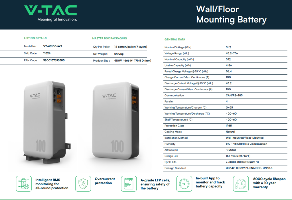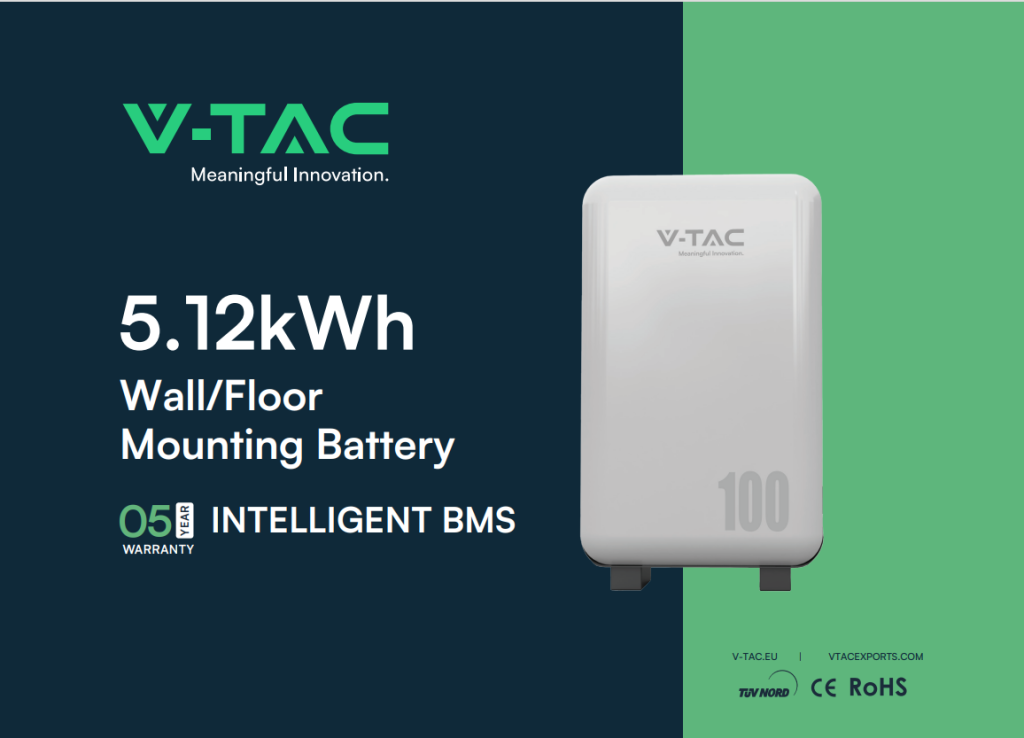 V-TAC Σύστημα Αποθήκευσης Ενέργειας BSS Επιτοίχιας/Επιδαπέδιας Τοποθέτησης 5.12kWh 51.2V IP65 Αδιάβροχη για Solar Inverter 11524