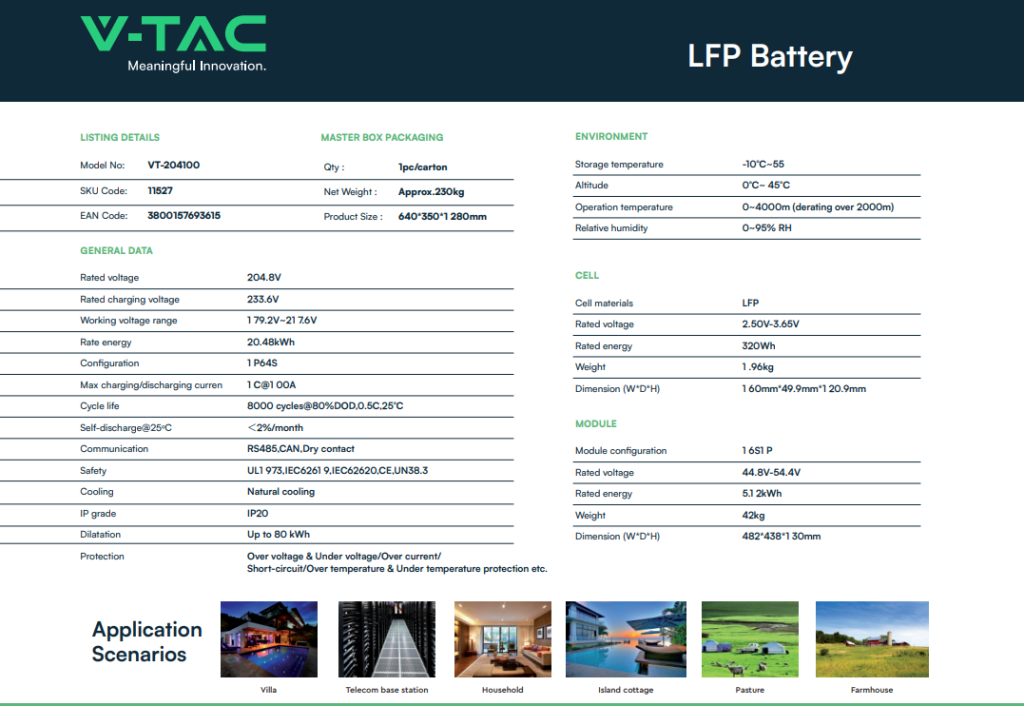 V-TAC Σύστημα Αποθήκευσης Ενέργειας BSS LiFePO4 20.48kWh 204.8V για Solar Inverter 8-12kW 11527