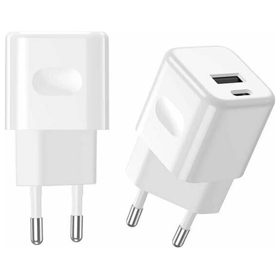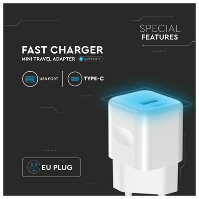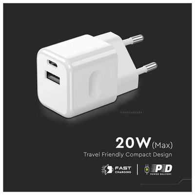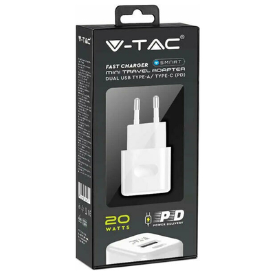 V-TAC Αντάπτορας ταχυφορτιστής ταξιδίου 20W δύο θυρών USB & Type-C με λευκό σώμα 6678