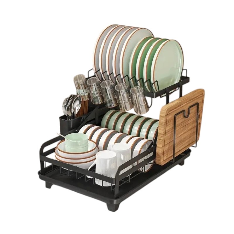 Πιατοθήκη αποστράγγισης διώροφη, μεταλλική, σε πρακτικό σχεδιασμό, με βάση ποτηριών και θήκη μαχαιροπίρουνων.