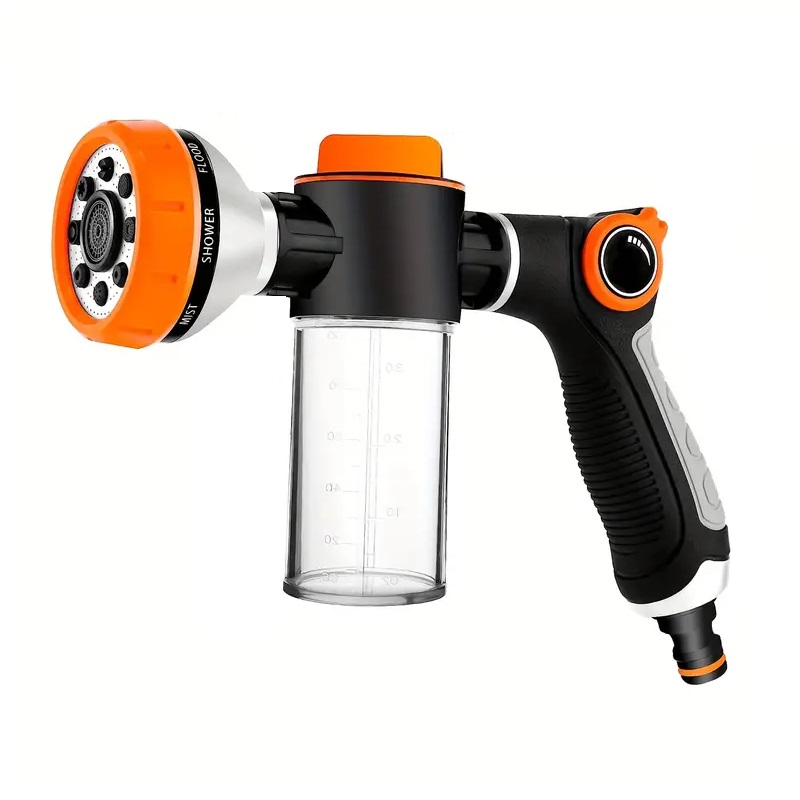 Πιστόλι ποτίσματος για λάστιχο με ενσωματωμένο δοχείο σαπουνιού 100ml. Διαθέτει εργονομική λαβή, 8 διαφορετικές ρυθμίσεις ψεκασμού και ρυθμιζόμενη πίεση. Διαστάσεις: 21x15cm. Απόσταση ψεκασμού: έως 10m.