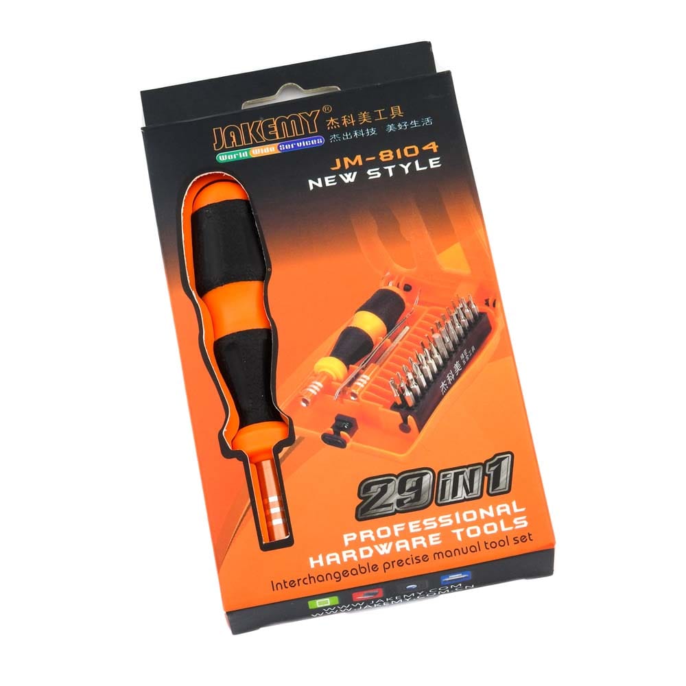 Σετ κατσαβίδι με μύτες JM-8104 από την JAKEMY. Ένα σετ 26 μυτών με κατσαβίδι, χρήσιμο για όλα τα εργαστήρια ηλεκτρονικών, τεχνικών smartphones και τεχνικών Η/Υ. Το σετ σας προσφέρει ένα κατσαβίδι 100mm με μαγνητική υποδοχή μυτών τύπου 4mm, ιδανικό για όλα τα laptops, tablets, smartphones και όχι μόνο. Με την εργονομική λαβή μπορείτε να δουλεύετε ξεκούραστα ακόμη και όταν πρόκειται για πολύωρη και συνεχή εργασία. Χάρη στην προέκταση μεταβλητού μήκους με σκάλες που προσφέρει το σετ, μπορείτε να έχετε πρόσβαση ακόμη και στα δυσκολότερα σημεία των εργασιών σας. Επίσης, η μαγνητική υποδοχή μυτών θα σας διευκολύνει στην γρήγορη αφαίρεση και εναλλαγή των μυτών. Περιεχόμενα: Εργαλεία: 1 κατσαβίδι μήκους 100mm για μύτες τύπου 4mm, με μαγνητική υποδοχή και αντιολισθητική λαβή 1 προέκταση μήκους 60mm 1 γωνιακή προσέλα Μύτες: 26 PCS 4*28mm κράμα χρωμίου Slotted: 1.5/ 2/ 2.5/ 3 Phillips: 1.5/ 2/ 2.5/ 3 Torx: T3/ T4/ T5/ T6/ T7/ T8/ T9/ T10/ T15/ T20 Hex: H1.3/ H1.5/ H3/ H4 Tri-Wing: Y2 Triangle: 2 Pentacle Star: 0.8 U-Shaped: U2.6 DOA 14 ημερών