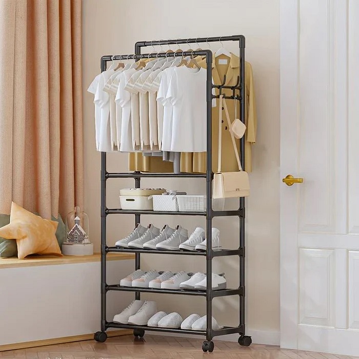 Τροχήλατη κρεμάστρα δαπέδου μεταλλική, με 5 ράφια και πλαϊνές κρεμάστρες, ιδανική ως έπιπλο εισόδου ή για την οργάνωση των ρούχων στο δωμάτιό σας.