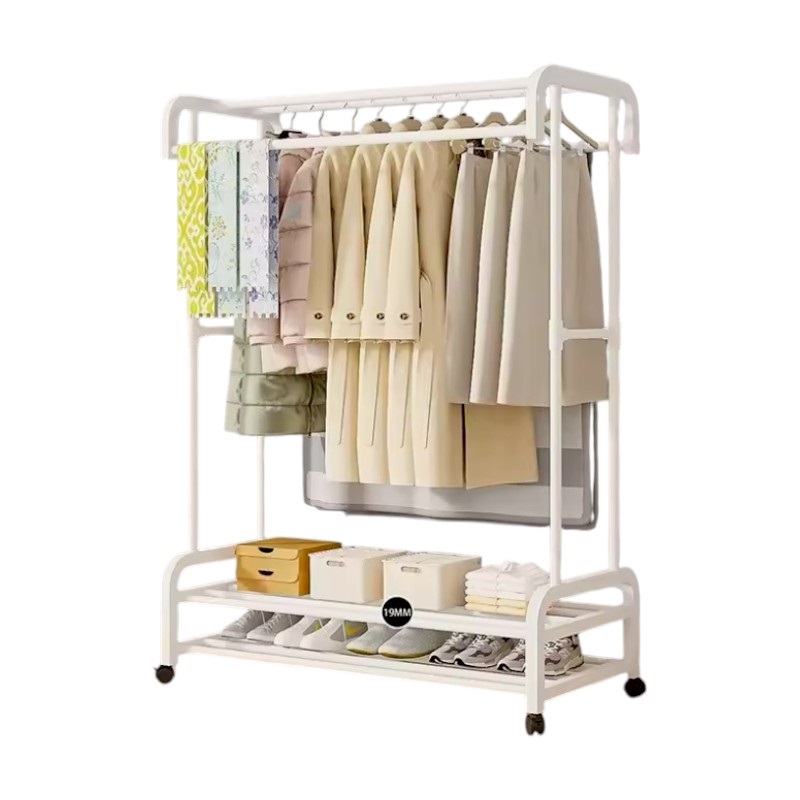 Τροχήλατη κρεμάστρα δαπέδου μεταλλική, με 2 ράφια παπουτσιών, ιδανική ως έπιπλο εισόδου ή για την οργάνωση των ρούχων στο δωμάτιό σας.