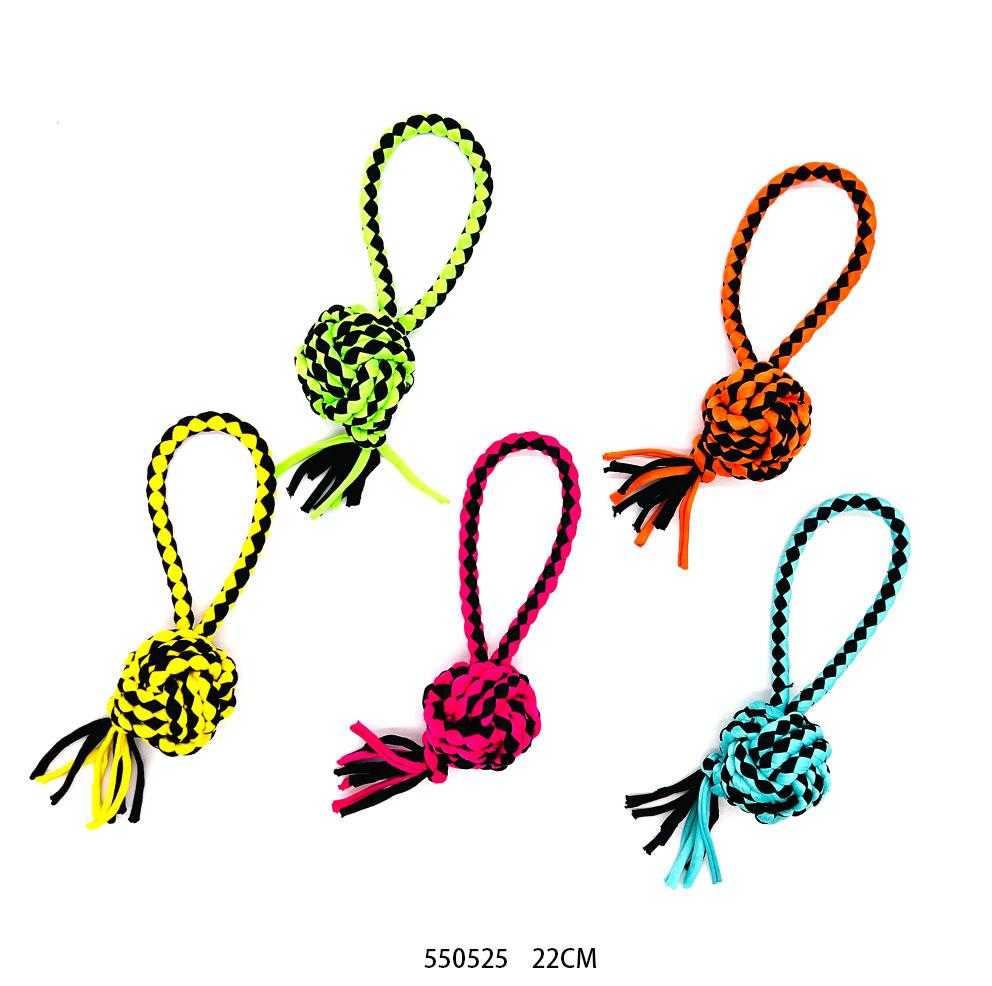 Παιχνίδι σκύλου μπάλα πλεκτή με σχοινί και λαβή, κατασκευασμένη από ιδιαίτερα ανθεκτικό πολυεστέρα, μη τοξικό, ιδανικό για παιχνίδια ανάκτησης και πολλαπλά είδη παιχνιδιού και άσκησης. Θα γίνει το αγαπημένο καθημερινό παιχνίδι που το σκυλί σας θα λατρέψει. Μήκος: 22cm.