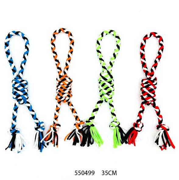 Παιχνίδι σκύλου σχοινί με κόμπους, από ανθεκτικό, μη τοξικό πολυεστέρα, ιδανικό για παιχνίδια τραβήγματος/αντίστασης ενώ παράλληλα βοηθά στην υγιεινή στόματος του σκύλου σας καθώς καθαρίζει ήπια και απασχολεί τα δόντια του. Συνολικό μήκος: 35cm.
