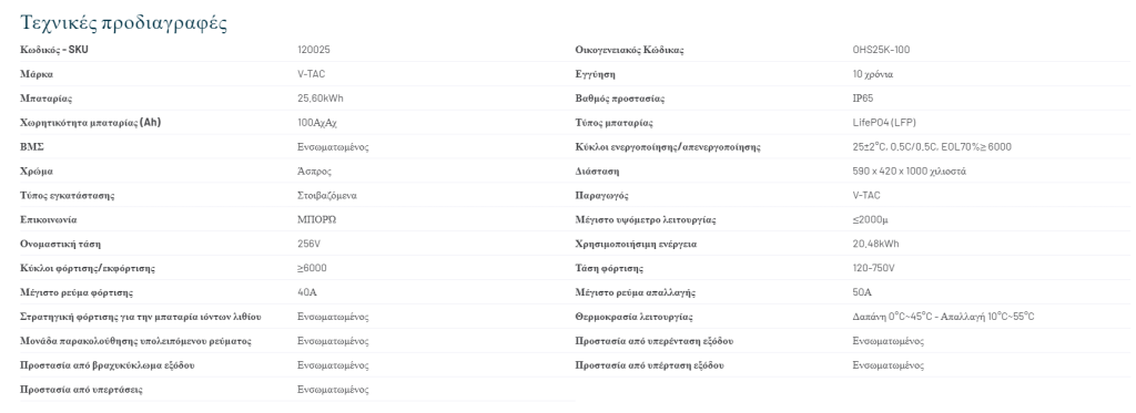 Το σύστημα V-TAC SKU 120025 (OHS25K-100) είναι μια αποτελεσματική λύση για αποθήκευση ενέργειας υψηλής τάσης. Αυτό το στοιβαζόμενο σύστημα προσφέρει ονομαστική χωρητικότητα 25,6 kWh και ωφέλιμη χωρητικότητα 20,48 kWh, εξασφαλίζοντας αξιόπιστη και σταθερή παροχή ισχύος για διαφορετικές ανάγκες. Αποτελείται από πέντε μονάδες των 5,12 kWh η καθεμία.