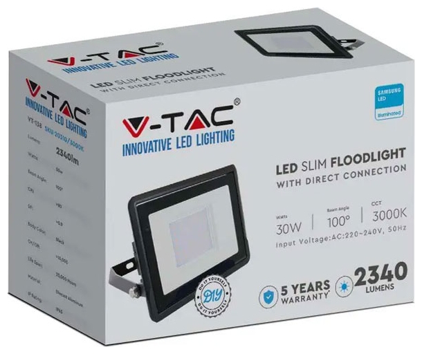 V-TAC Προβολέας LED SMD 30W 2340lm Samsung Chip με Ενσωματωμένο Στυπιοθλίπτη Μαύρο Σώμα Φυσικό Λευκό 20311