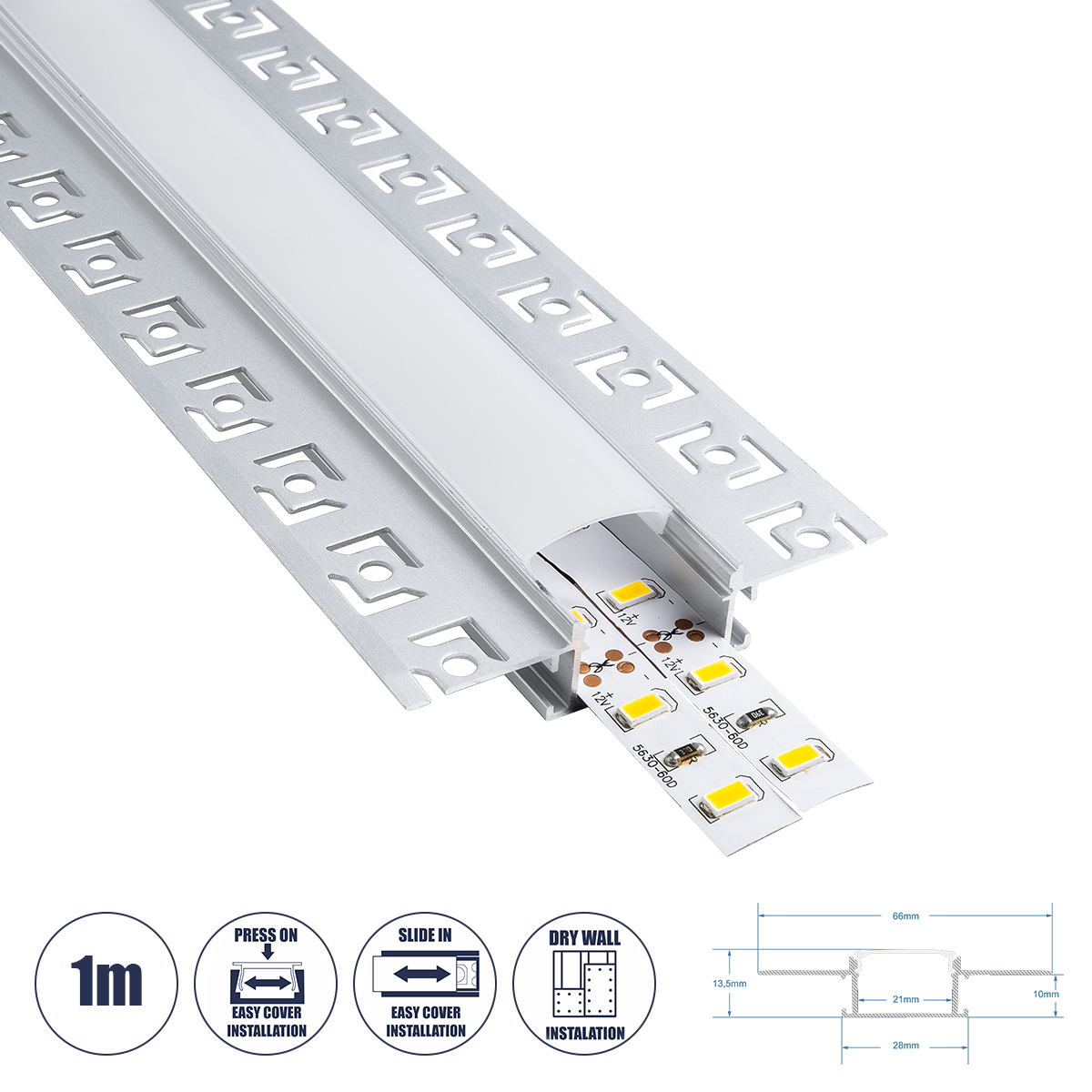 GloboStar® PLASTERBOARD-PROFILE 70819-1M Προφίλ Αλουμινίου - Βάση & Ψύκτρα Ταινίας LED με Λευκό Γαλακτερό Κάλυμμα - Χωνευτή Χρήση σε Γυψοσανίδα - Trimless - Πατητό Κάλυμμα - Ασημί - 1 Μέτρο - Μ100 x Π6.7 x Υ1.4cm