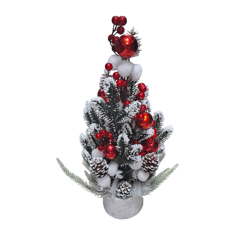 Χριστουγεννιάτικο διακοσμητικό δεντράκι με επιτραπέζια βάση και εντυπωσιακή σύνθεση με στολίδια και υπέροχες ρεαλιστικές λεπτομέρειες. Διαστάσεις: 40*18cm.